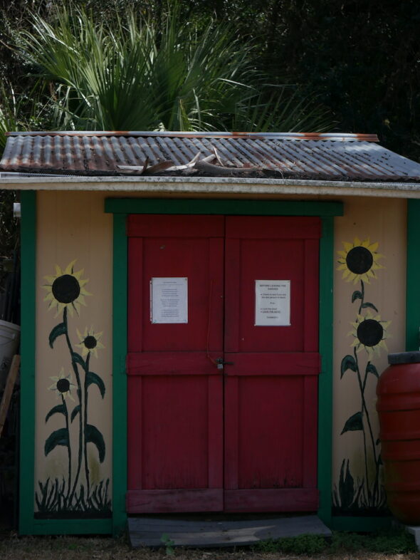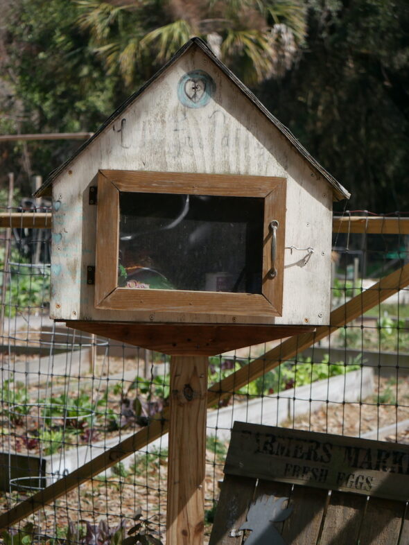 This structure is really essential to the function of the garden. In summer, when Florida’s heat bears down and some seasonal residents head north, weeds can quickly take over. Gardeners are asked to lay cardboard over empty beds to suppress weeds and prevent their spread. When the Florida sun sends up flowering shoots, crops turn bitter.